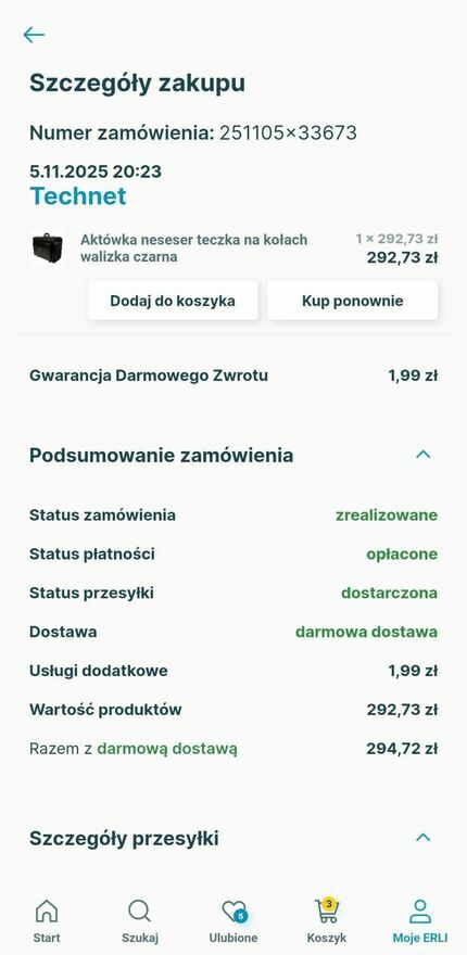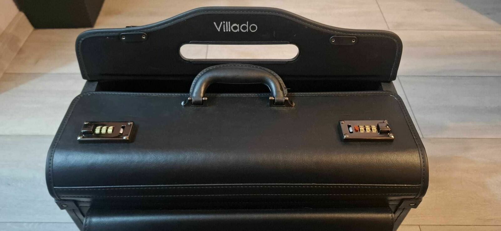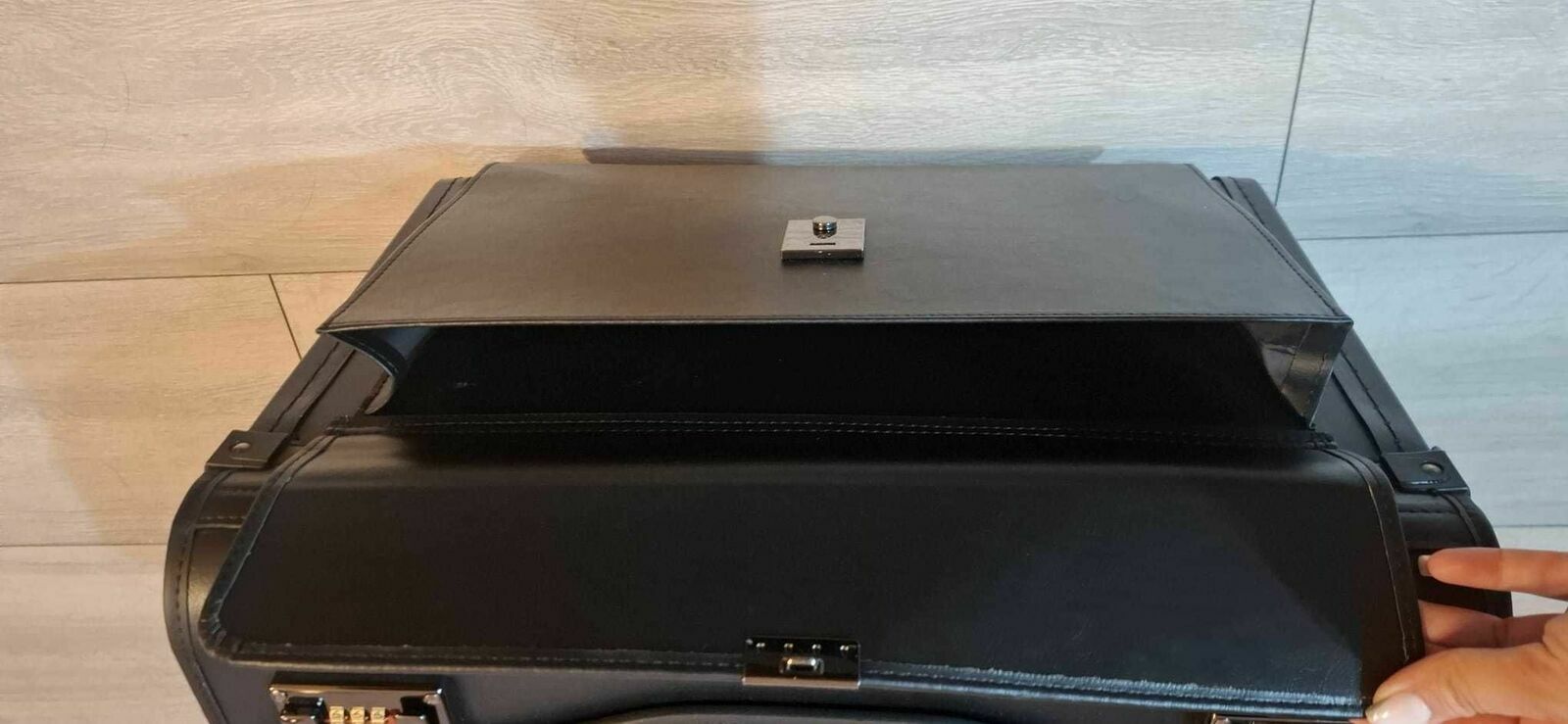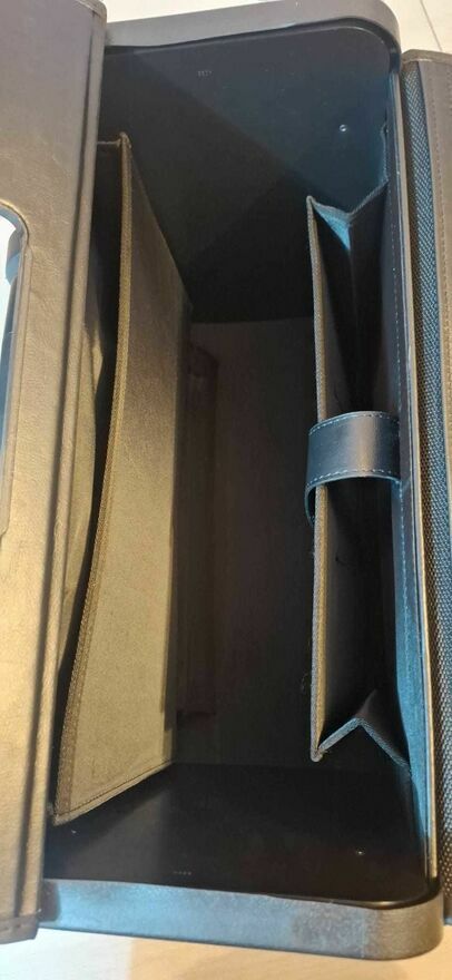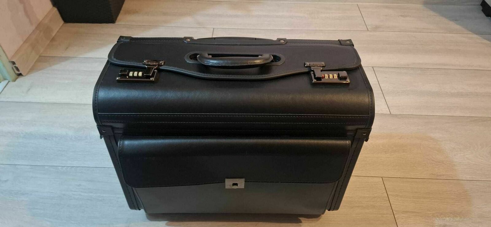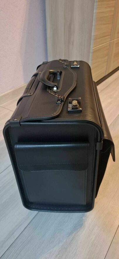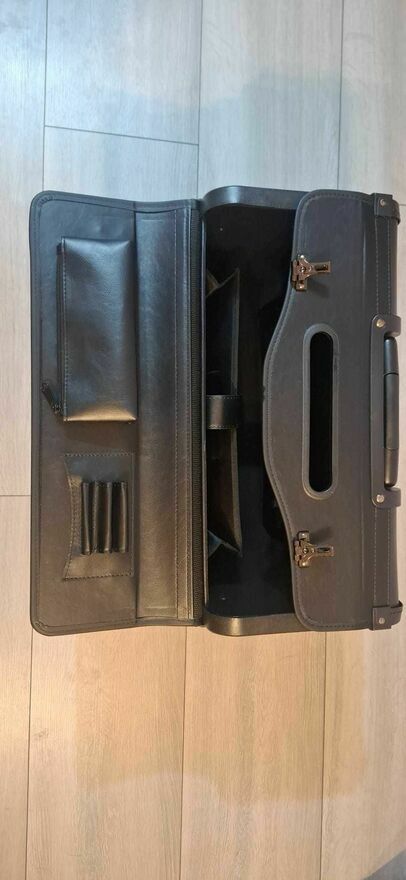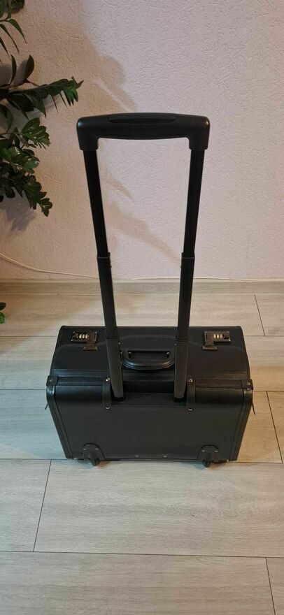 Produkt kupiony na stronie Erli za 292.73 zł w dniu 05.11.25r. lecz okazał się zbyt duży na moje potrzeby. Użyty 2 krotnie, ślady użytkowania widoczne jedynie na kółkach.Czarna teczka aktówka (walizka) wykonana ze skóry ekologicznej. Wnętrze teczki wyłożone jest kolorystycznie dopasowanym czarnym materiałem.