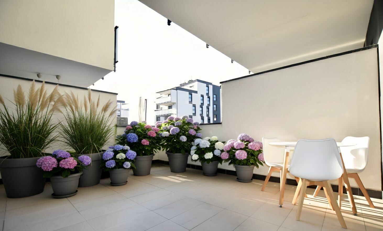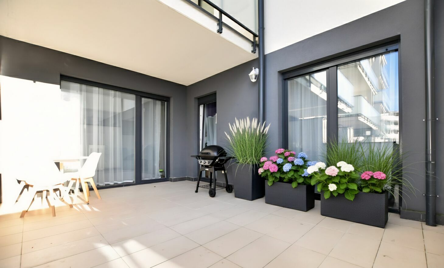 Niewątpliwym atutem nieruchomości jest częściowo zadaszony taras z wysokim murkiem dający prywatność.