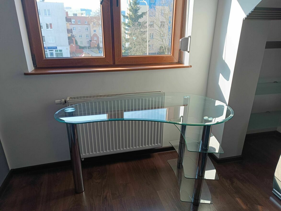 Przezroczyste, szklane , eleganckie biurko w bardzo dobrym stanie. Nadaje się do użytku w domu lub biurze. Wymiary biurka jak na dołączonych zdjęciach. Gorąco polecam.Małgosia