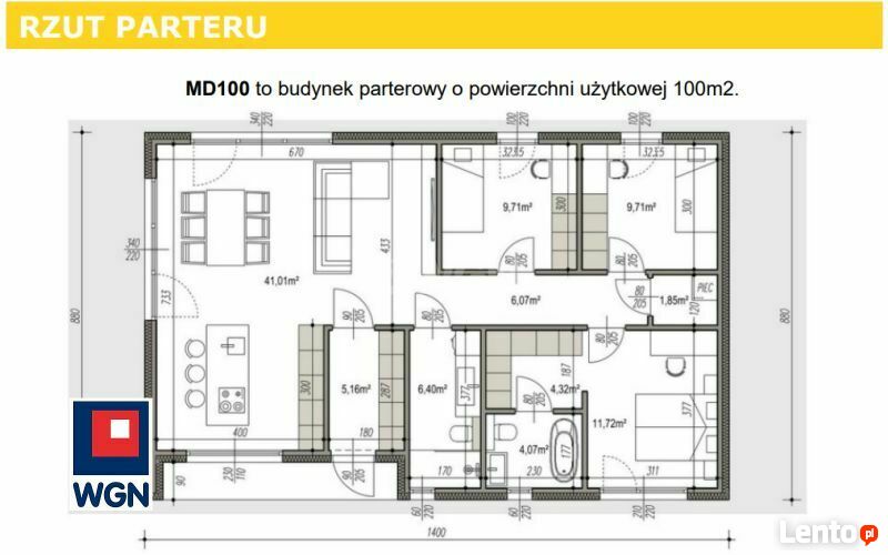 Wymiary: 14,00 x 8,8 m, dach 35-40