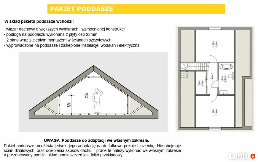 Pakiet PODDASZE UŻYTKOWE(opcja dodatkowa) +32,58 m²: 2 pokoje po 11,39 m² każdy; łazienka – 3,93 m²; Korytarz – 4,49 m²; garderoba – 1,38 m².
