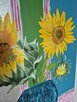 Piękny obraz akrylowy przedstawiający słoneczniki w niebieskim wazonie na tle kolorowych kształtów. Obraz wykonany w ...