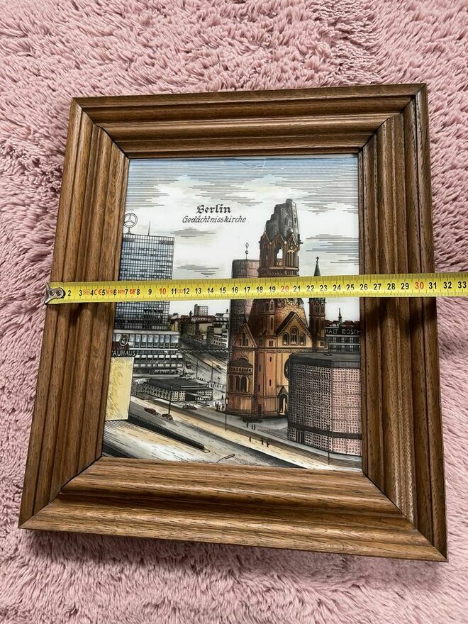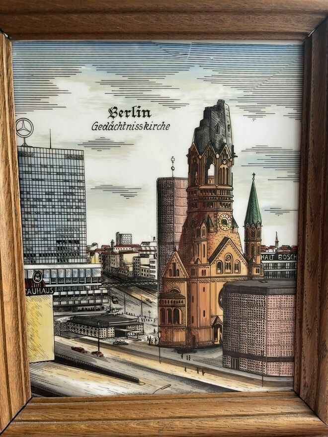 Piękny obraz przedstawiający panoramę Berlina z charakterystyczną Gedächtniskirche. Obraz oprawiony w drewnianą ramę, która nadaje mu elegancki wygląd. Doskonała dekoracja do domu lub biura, która przypomni o uroku tego niemieckiego miasta.Anna